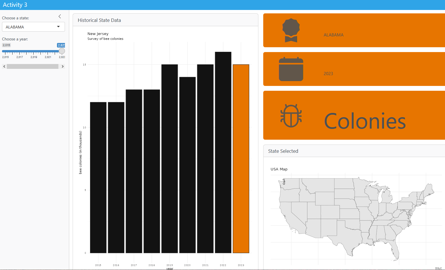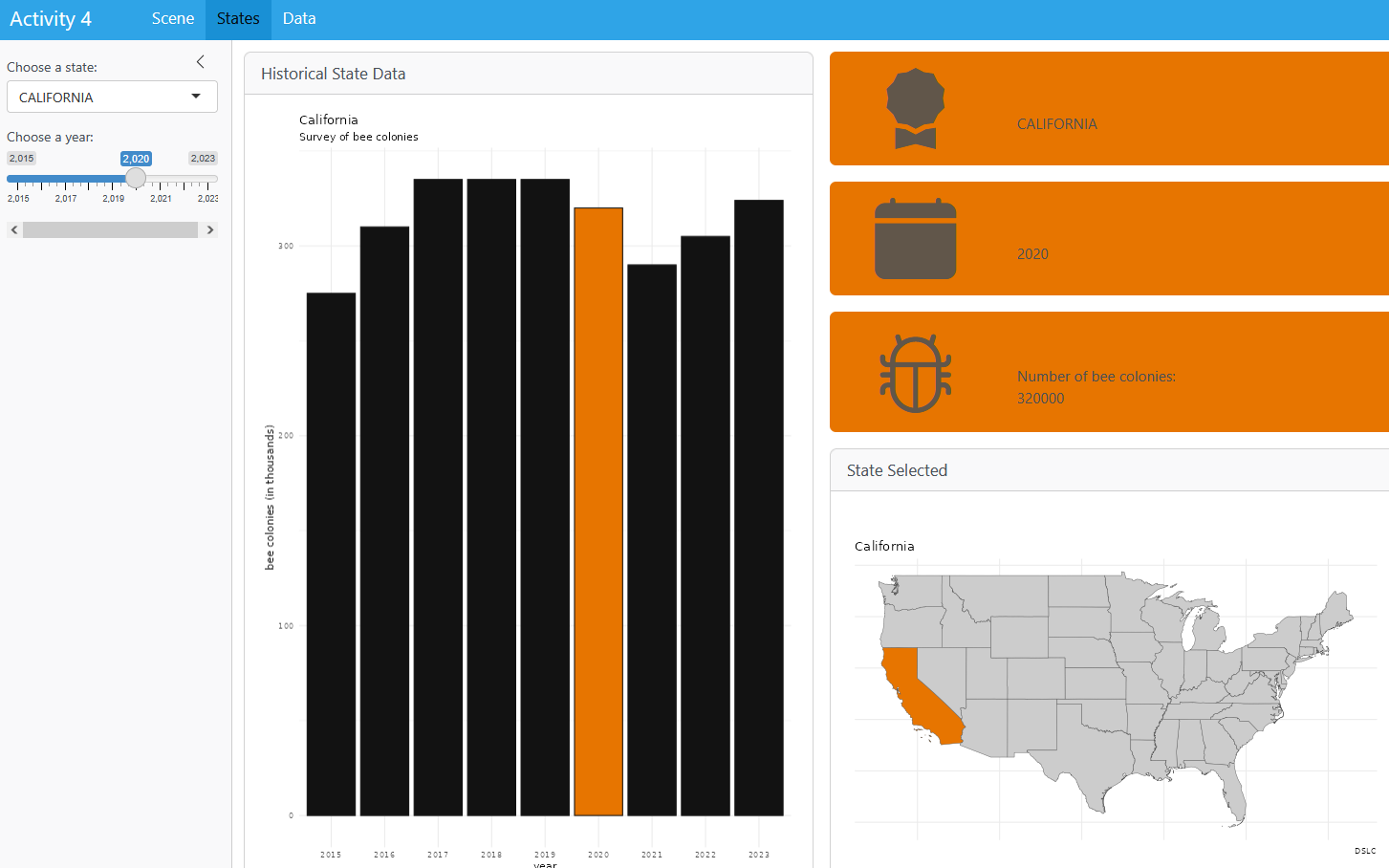 year_choiceto affect which state is highlighted in the state map - correctly restate the number of bee colonies for the user’s selections of state and year.