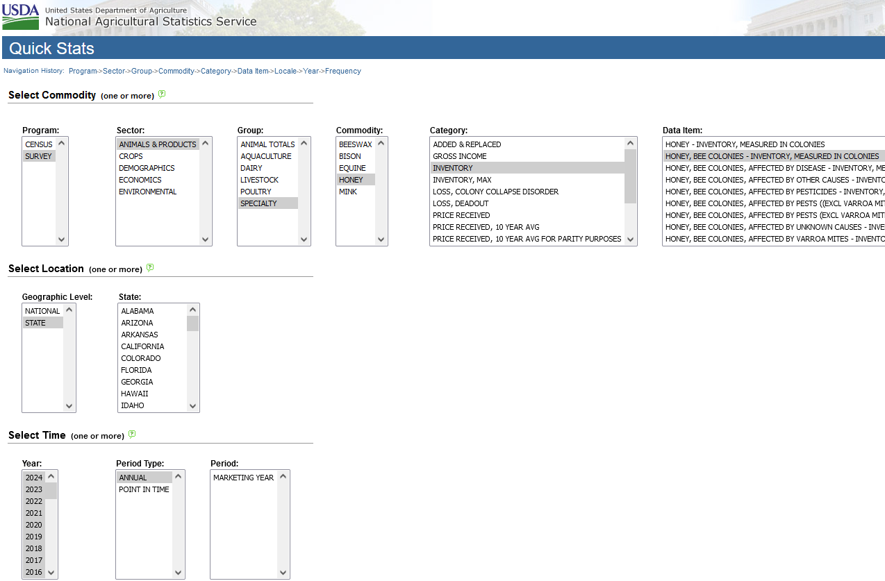 Our data come from the Quick Stats at USDA NASS (United States Department of Agriculture National Agricultural Statistics Service). Users can access a subset of the data through dropdown menus. For replicability, I list my selections below: