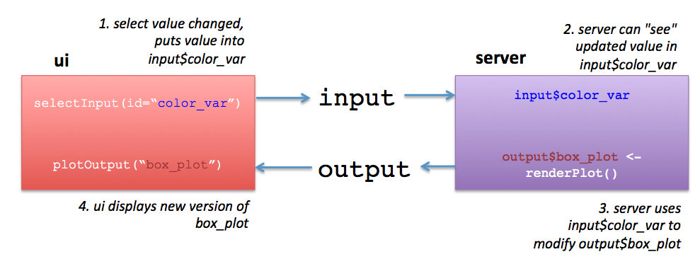 Fortunately, for this relatively simple app, the usual dplyr verbs work well with our data. Just remember when to call variables from the input selections. For example, when the user makes their choice among the states, the result is stored in input$state_choice, and we can use it in filter: